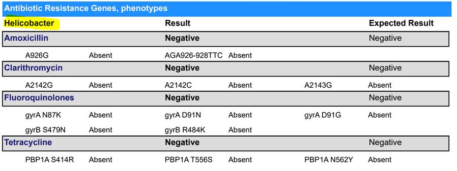 Also I would like to mention that I did an GI Map test and they found H pylori there (Helicobacter pylori 1.4e3 High <1.0e3) but the resistance was not found, could this be a false -ve (attached)? as I have taken two therapy for it already.