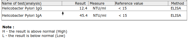 So to my understanding this shows I had hpylori in the past (because of the high IgA), but I do not have it now (because of the lower IgG which reacts faster as what I read). With negative predictive value of more than 90% of IgG it is highly unlikely I have active infection. On the other end I am close to the cut-off of 15 and I read in some paper about 7% of negative IgG and positive IgA are still hpylori positive for unknown reason. What do you think, can I conclude I am hpylori free or still have to do stool/UBT?